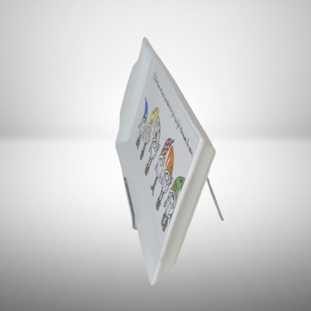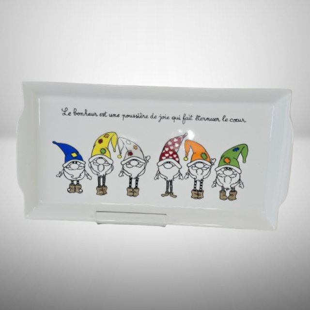 Sur ce plat de présentation, des gnômes, aux couleurs vives, ont été peints.