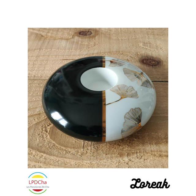 Sur ce bougeoir moderne, deux zones ont été délimitées par une bande en or. D'un côté des fleurs ont été décorées et sur l'autre un pigment de couleur vert foncé a été posé.