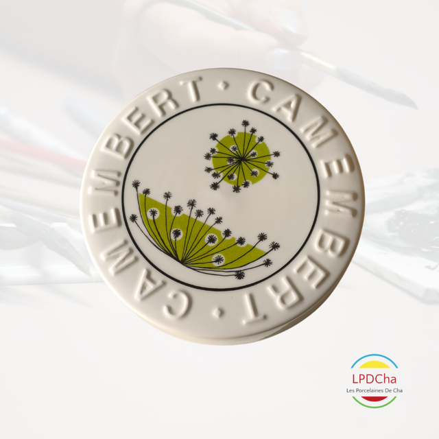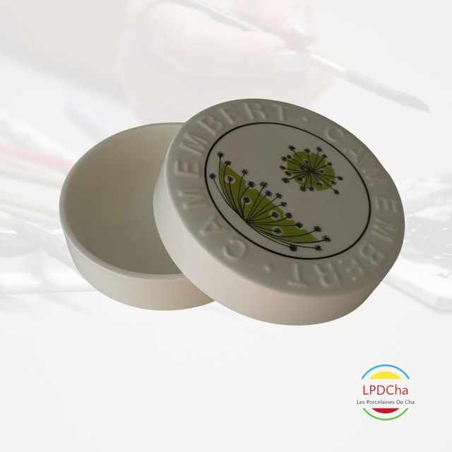 J19/16-25-08-11 - Boite à camembert en porcelaine blanche peinte à la main.
