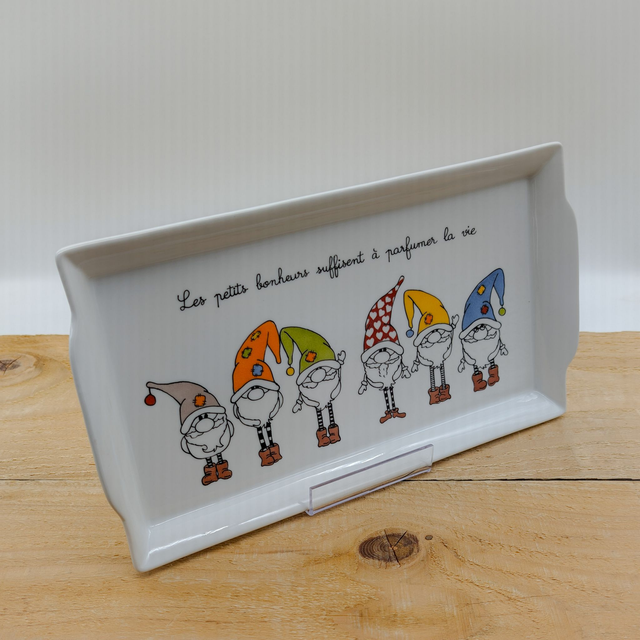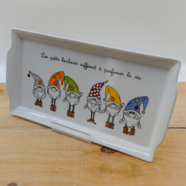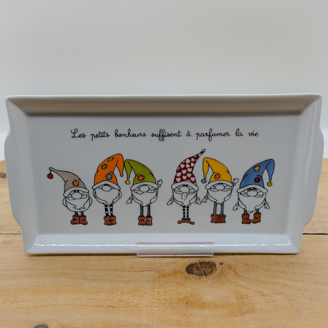 Sur ce plat de présentation, des gnômes, aux bonnets de couleurs vives, ont été peints.