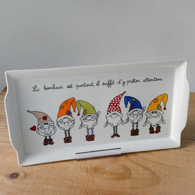 Sur ce plat de présentation, des gnômes, aux bonnets de couleurs vives, ont été peints.