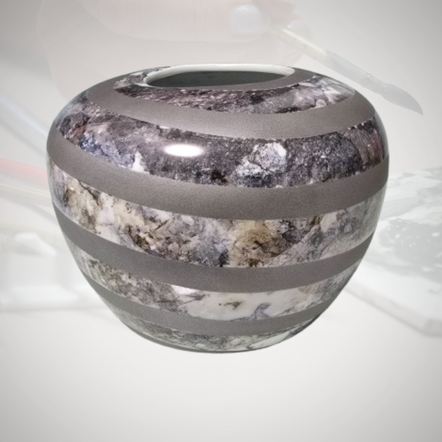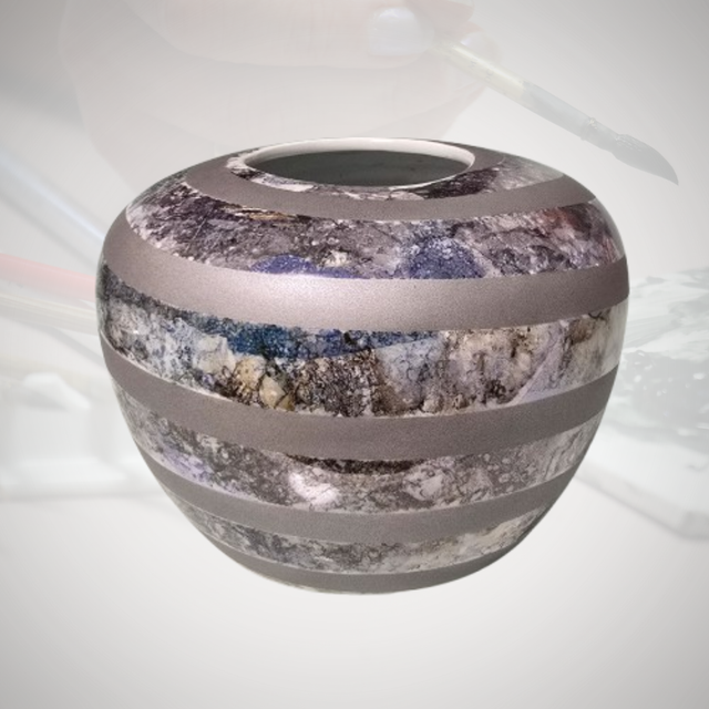 Vase en forme de pomme. Lustre posé puis bandes métalliques peintes. Idéal pour des bouquets ronds.