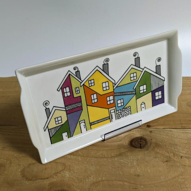 Sur ce plat de présentation, un village baroque imaginaire, aux couleurs vives, a été peint.