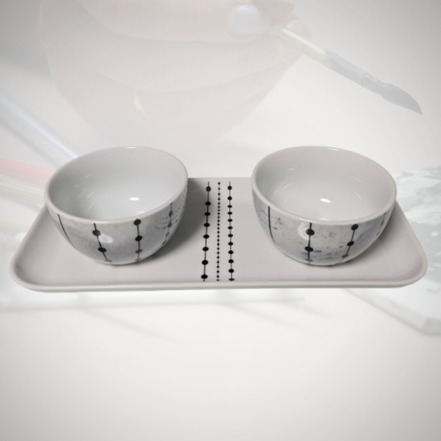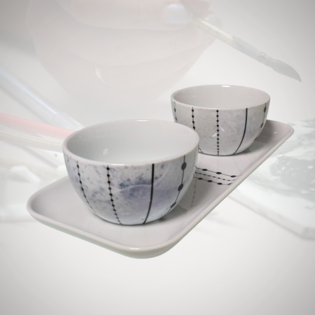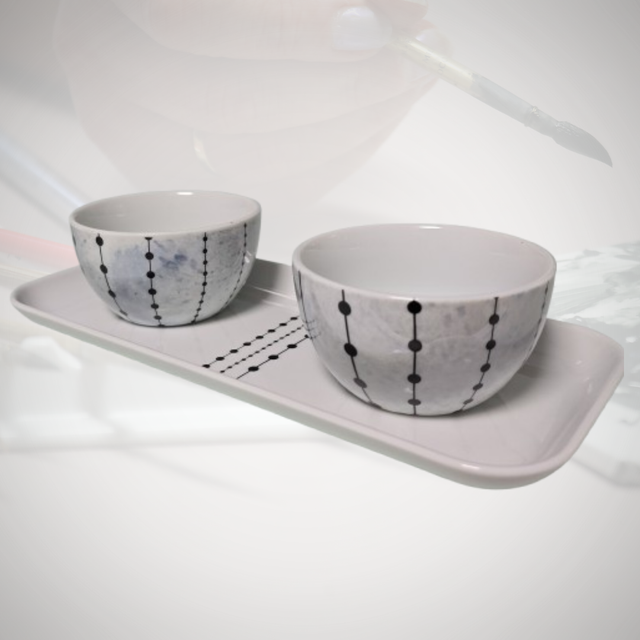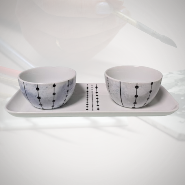 Cet ensemble raffiné se compose de deux coupelles en porcelaine, délicatement décorées à la main. Le lustre bleu, associé à une élégante frise de perles noires, crée une harmonie parfaite entre l'artisanat traditionnel et l'élégance contemporaine. Les coupelles sont présentées sur un plateau assorti, reprenant la même frise, ce qui en fait un ensemble cohérent et esthétique, idéal pour un cadeau ou pour sublimer votre décoration intérieure.
