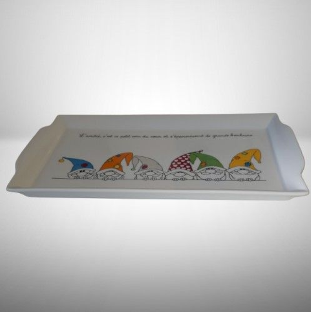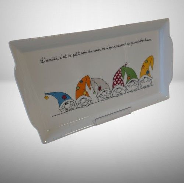 Sur ce plat de présentation, des gnômes, aux couleurs vives, ont été peints.